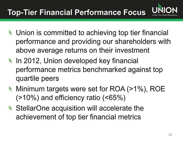 Top - Tier Financial Performance Focus Union is committed to achieving top tier financial performance and providing our shareholders with above average returns on their investment In 2012, Union developed key financial performance metrics benchmarked against top quartile peers Minimum targets were set for ROA (>1%), ROE (>10%) and efficiency ratio (<65%) StellarOne acquisition will accelerate the achievement of top tier financial metrics 22