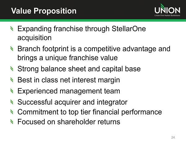 2013 Second Half Outlook Stable to growing economy in footprint Low mid - single digit loan growth Modest margin compression Continued asset quality improvement Improving ROA, ROE and Efficiency Ratio Focus on integration of StellarOne 23