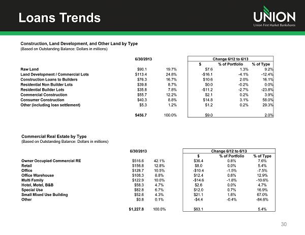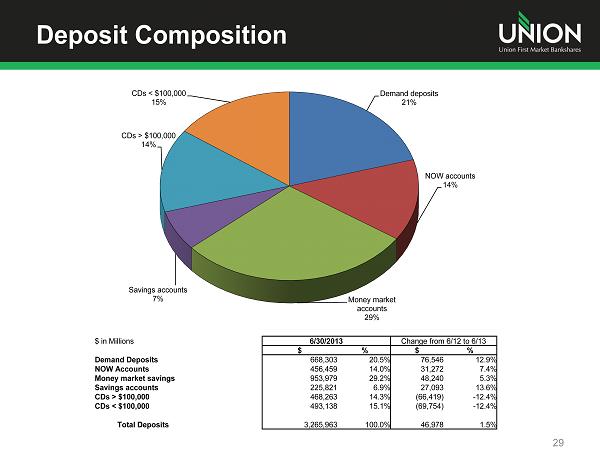 Loan Portfolio 28 Construction, Land Development, and Other Land, 15.2% Commercial Real Estate, 40.9% Residential 1 - 4 Family, 15.9% Equity Lines of Credit , 10.0% Second Mortgages, 1.3% Commercial , 6.1% Personal , 7.9% Credit Cards , 0.7% Other, 2.0% Based on call report filings ($ in millions) 6/30/2013 Change 6/12 to 6/13 $ % $ % of Portfolio % of Type Construction, Land Development, and Other Land $456.7 15.2% $9.0 - 0.3% 2.0% Commercial Real Estate $1,227.8 40.9% $63.1 0.6% 5.4% Residential 1 - 4 Family $478.4 15.9% $19.7 0.1% 4.3% Equity Lines of Credit $298.6 10.0% - $6.0 - 0.6% - 2.0% Second Mortgages $37.9 1.3% - $11.6 - 0.5% - 23.4% Commercial $182.4 6.1% $11.8 0.2% 6.9% Personal $235.8 7.9% $4.5 - 0.2% 1.9% Credit Cards $21.9 0.7% $2.2 0.0% 11.2% Other $61.3 2.0% $20.3 0.6% 49.5% Gross Loans $3,000.8 100.0% $113.0 3.9%