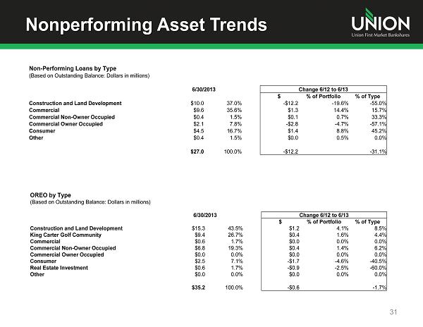 Loans Trends 30 Construction, Land Development, and Other Land by Type (Based on Outstanding Balance: Dollars in millions) 6/30/2013 Change 6/12 to 6/13 $ % of Portfolio % of Type Raw Land $90.1 19.7% $7.6 1.3% 9.2% Land Development / Commercial Lots $113.4 24.8% - $16.1 - 4.1% - 12.4% Construction Loans to Builders $76.3 16.7% $10.6 2.0% 16.1% Residential Non Builder Lots $39.8 8.7% $0.0 - 0.2% 0.0% Residential Builder Lots $35.8 7.8% - $11.2 - 2.7% - 23.8% Commercial Construction $55.7 12.2% $2.1 0.2% 3.9% Consumer Construction $40.3 8.8% $14.8 3.1% 58.0% Other (including loan settlement) $5.3 1.2% $1.2 0.2% 29.3% $456.7 100.0% $9.0 2.0% Commercial Real Estate by Type (Based on Outstanding Balance: Dollars in millions) 6/30/2013 Change 6/12 to 6/13 $ % of Portfolio % of Type Owner Occupied Commercial RE $516.6 42.1% $36.4 0.8% 7.6% Retail $156.8 12.8% $8.0 0.0% 5.4% Office $128.7 10.5% - $10.4 - 1.5% - 7.5% Office Warehouse $108.3 8.8% $12.4 0.6% 12.9% Multi Family $122.9 10.0% - $14.6 - 1.8% - 10.6% Hotel, Motel, B&B $58.3 4.7% $2.6 0.0% 4.7% Special Use $82.8 6.7% $12.0 0.7% 16.9% Small Mixed Use Building $52.6 4.3% $21.1 1.6% 67.0% Other $0.8 0.1% - $4.4 - 0.4% - 84.6% $1,227.8 100.0% $63.1 5.4%