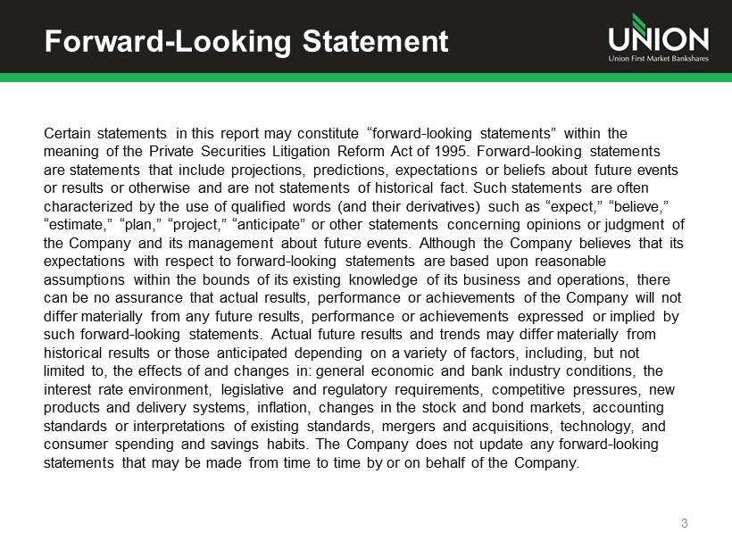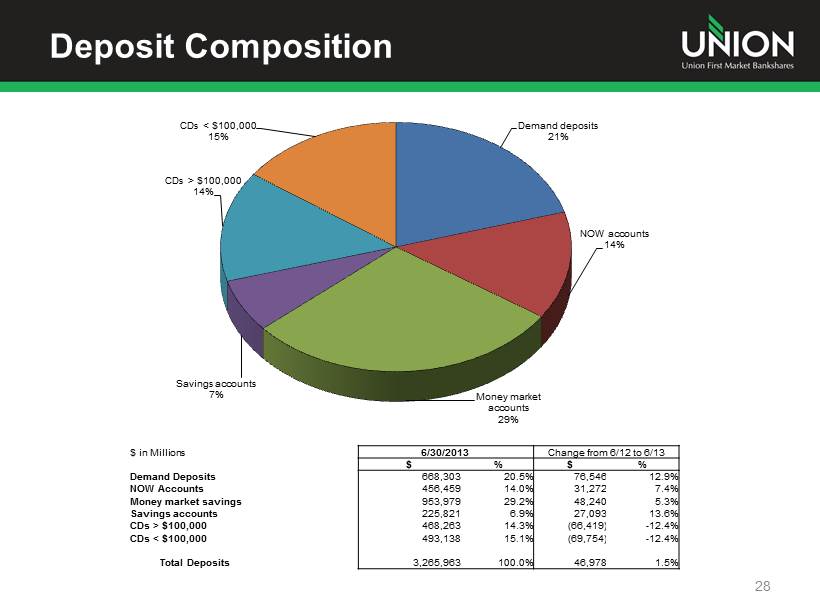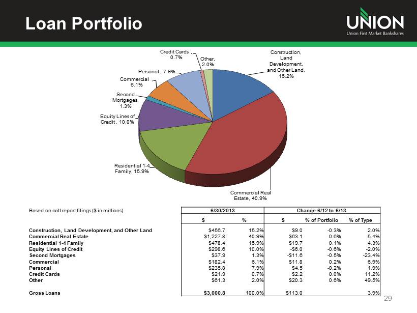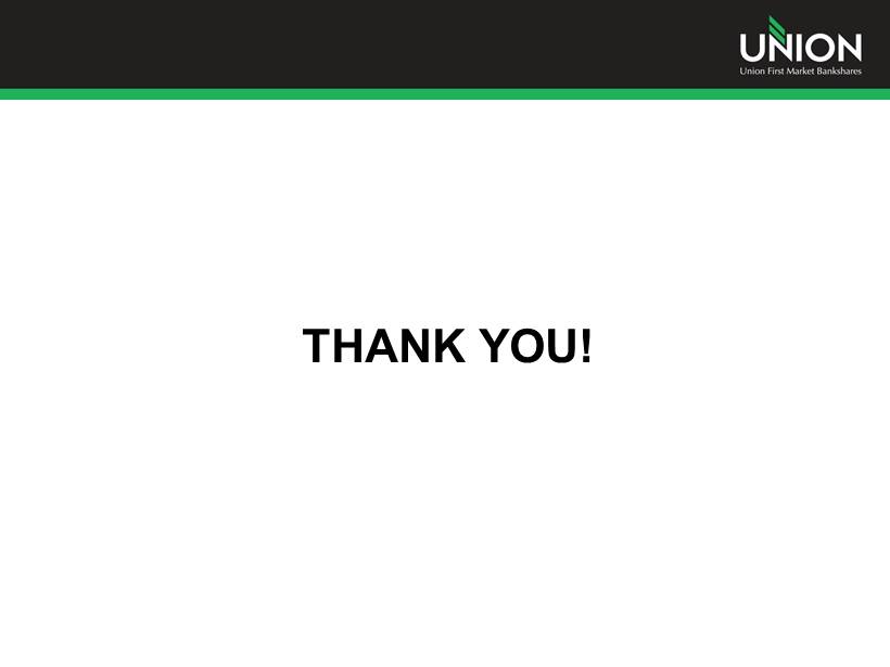 Additional Information Additional Information and Where to Find It In connection with the proposed merger, Union will file with the Securities and Exchange Commission (the “SEC”) a registration statement on Form S - 4 to register the shares of Union common stock to be issued to the stockholders of StellarOne . The registration statement will include a joint proxy statement/prospectus which will be sent to the stockholders of Union and StellarOne seeking their approval of the merger and related matters . In addition, each of Union and StellarOne may file other relevant documents concerning the proposed merger with the SEC . Investors and stockholders of both companies are urged to read the registration statement on Form S - 4 and the joint proxy statement/prospectus included within the registration statement and any other relevant documents to be filed with the SEC in connection with the proposed merger because they will contain important information about Union, StellarOne and the proposed transaction . Investors and stockholders may obtain free copies of these documents through the website maintained by the SEC at www . sec . gov . Free copies of the joint proxy statement/prospectus also may be obtained by directing a request by telephone or mail to Union First Market Bankshares Corporation, 1051 East Cary Street, Suite 1200 , Richmond, Virginia 23219 , Attention : Investor Relations (telephone : ( 804 ) 633 - 5031 ), or StellarOne Corporation, 590 Peter Jefferson Pkwy, Suite 250 , Charlottesville, Virginia 22911 , Attention : Investor Relations (telephone : ( 434 ) 964 - 2217 ), or by accessing Union’s website at www . bankatunion . com under “Investor Relations” or StellarOne’s website at www . stellarone . com under “Investor Relations . ” The information on Union’s and StellarOne’s websites is not, and shall not be deemed to be, a part of this presentation or incorporated into other filings either company makes with the SEC . Union and StellarOne and their respective directors and executive officers may be deemed to be participants in the solicitation of proxies from the stockholders of Union and/or StellarOne in connection with the merger . Information about the directors and executive officers of Union is set forth in the proxy statement for Union’s 2013 annual meeting of stockholders filed with the SEC on April 23 , 2013 . Information about the directors and executive officers of StellarOne is set forth in the proxy statement for StellarOne’s 2013 annual meeting of stockholders filed with the SEC on April 9 , 2013 . Additional information regarding the interests of these participants and other persons who may be deemed participants in the merger may be obtained by reading the joint proxy statement/prospectus regarding the merger when it becomes available . 26
