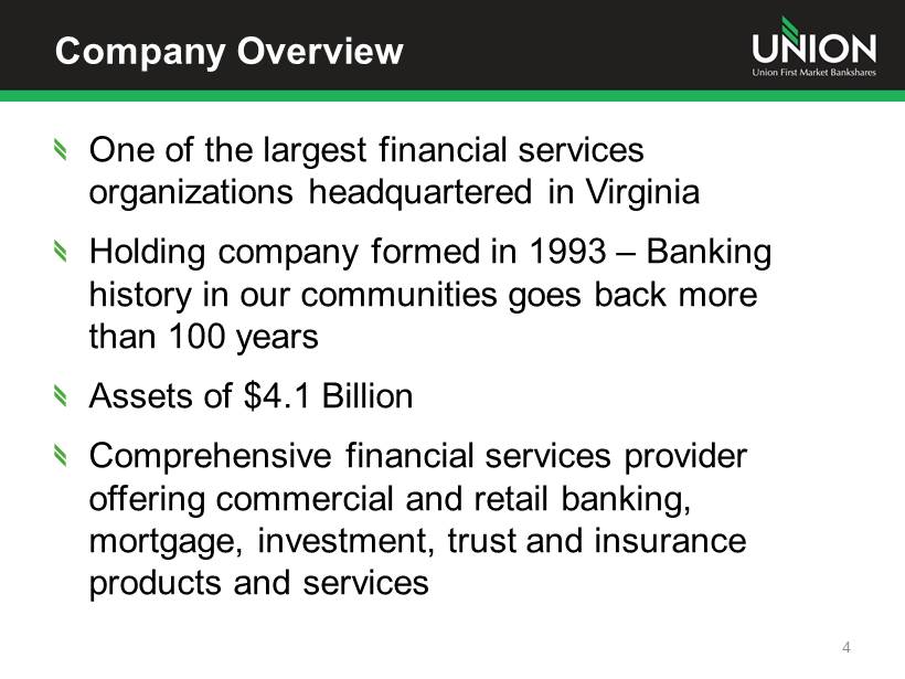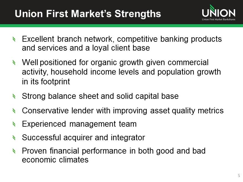 Company Overview One of the largest financial services organizations headquartered in Virginia Holding company formed in 1993 – Banking history in our communities goes back more than 100 years Assets of $4.1 Billion Comprehensive financial services provider offering commercial and retail banking, mortgage, investment, trust and insurance products and services 4