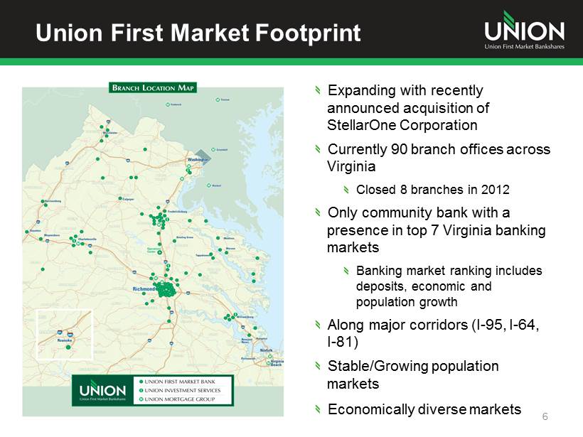 Union First Market’s Strengths Excellent branch network, competitive banking products and services and a loyal client base Well positioned for organic growth given commercial activity, household income levels and population growth in its footprint Strong balance sheet and solid capital base Conservative lender with improving asset quality metrics Experienced management team Successful acquirer and integrator Proven financial performance in both good and bad economic climates 5