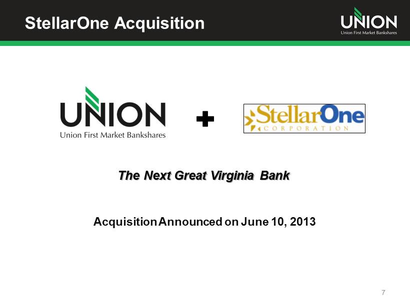 Union First Market Footprint 6 Expanding with recently announced acquisition of StellarOne Corporation Currently 90 branch offices across Virginia Closed 8 branches in 2012 Only community bank with a presence in top 7 Virginia banking markets Banking market ranking includes deposits, economic and population growth Along major corridors (I - 95, I - 64, I - 81) Stable/Growing population markets Economically diverse markets