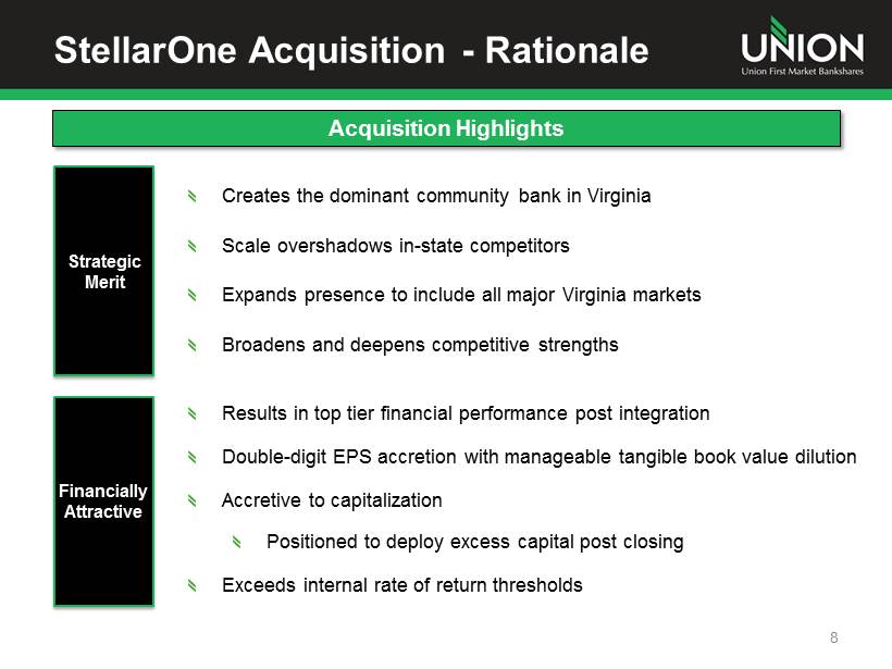 7 Acquisition Announced on June 10, 2013 The Next Great Virginia Bank StellarOne Acquisition