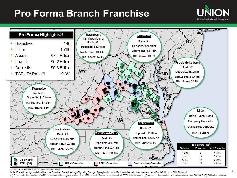Creates the dominant community bank in Virginia Scale overshadows in - state competitors Expands presence to include all major Virginia markets Broadens and deepens competitive strengths StellarOne Acquisition - Rationale 8 Acquisition Highlights Strategic Merit Results in top tier financial performance post integration Double - digit EPS accretion with manageable tangible book value dilution Accretive to capitalization Positioned to deploy excess capital post closing Exceeds internal rate of return thresholds Financially Attractive