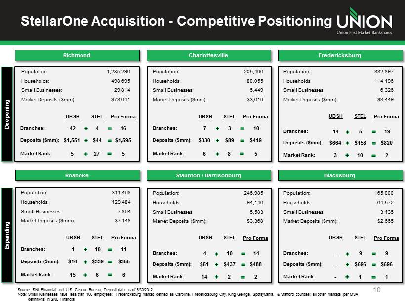 Pro Forma Branch Franchise 9 Source: SNL Financial and MapInfo Professional Note: Fredericksburg market defined as Caroline, Fredericksburg City, King George, Spotsylvania, & Stafford counties; all oth er markets per MSA definitions in SNL Financial (1) Represents the number of STEL branches within a given radius of a UBSH branch; Shown as a percent of STEL total branches (2 ) Assumes transaction was consummated on 3/31/2013 (3) Estimated at close NC DC VA AL CT DE GA IL IN KY MA MD MI MS NJ NY OH RI SC TN WV UBSH Counties STEL Counties Overlapping Counties UBSH (90) STEL (56) Richmond Rank: #5 Deposits: $1.6 bn Market Tot.: $73.6 bn Mkt. Share: 5.3% Blacksburg Rank: #1 Deposits: $696 mm Market Tot.: $2.7 bn Mkt. Share: 26.1% Staunton / Harrisonburg Rank: #2 Deposits: $488 mm Market Tot.: $3.4 bn Mkt. Share: 14.4% Branch Overlap(1) Distance Branches % of Franchise < 1/2 mi: 8 14.3% < 1 mi: 13 23.2% < 2 mi: 19 33.9% < 5 mi: 26 46.4% Culpeper Rank: #1 Deposits: $202 mm Market Tot.: $0.6 bn Mkt. Share: 33.5% MSA Market Share Rank Company Deposits Total Market Deposits Market Share Roanoke Deposits: $355 mm Market Tot.: $7.2 bn Mkt. Share: 4.9% Rank : #6 Charlottesville Rank: #5 Deposits: $419 mm Market Tot.: $3.6 bn Mkt. Share: 11.6% VA Fredericksburg Rank: #2 Deposits: $820mm Market Tot.: $3.4 bn Mkt. Share: 23.7% Pro Forma Highlights (2) Branches FTEs Assets Loans Deposits TCE / TA Ratio (3) 146 1,766 $7.1 Billion $5.2 Billion $5.8 Billion ~ 9.3%