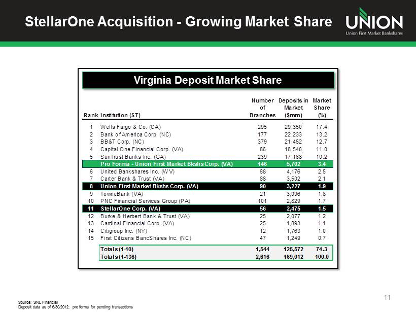 StellarOne Acquisition - Competitive Positioning 10 Richmond Charlottesville Source: SNL Financial and U.S. Census Bureau; Deposit data as of 6/30/2012 Note: Small businesses have less than 100 employees; Fredericksburg market defined as Caroline, Fredericksburg City, King Geo rge , Spotsylvania, & Stafford counties; all other markets per MSA definitions in SNL Financial Staunton / Harrisonburg Population: Households: Small Businesses: Market Deposits ($mm): UBSH Branches: Deposits ($mm): Pro Forma 42 4 46 $1,551 $44 $1,595 1,285,296 498,695 29,814 $73,641 STEL Population: Households: Small Businesses: Market Deposits ($mm): UBSH Branches: Deposits ($mm): Pro Forma 7 3 10 $330 $89 $419 205,406 80,055 5,449 $3,610 STEL Population: Households: Small Businesses: Market Deposits ($mm): UBSH Branches: Deposits ($mm): Pro Forma 4 10 14 $51 $437 $488 246,985 94,146 5,583 $3,368 STEL Market Rank: 5 27 5 Market Rank: 6 8 5 Roanoke Population: Households: Small Businesses: Market Deposits ($mm): UBSH Branches: Deposits ($mm): Pro Forma 1 10 11 $16 $339 $355 311,468 129,484 7,864 $7,148 STEL Market Rank: 15 6 6 Blacksburg Population: Households: Small Businesses: Market Deposits ($mm): UBSH Branches: Deposits ($mm): Pro Forma - 9 9 - $696 $696 165,000 64,572 3,135 $2,665 STEL Market Rank: - 1 1 Market Rank: 14 2 2 Fredericksburg Population: Households: Small Businesses: Market Deposits ($mm): UBSH Branches: Deposits ($mm): Pro Forma 14 5 19 $664 $156 $820 332,897 114,196 6,326 $3,449 STEL Market Rank: 3 10 2 Deepening Expanding