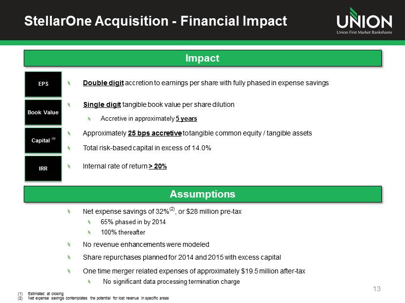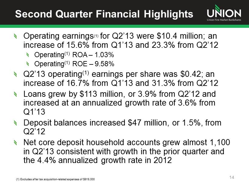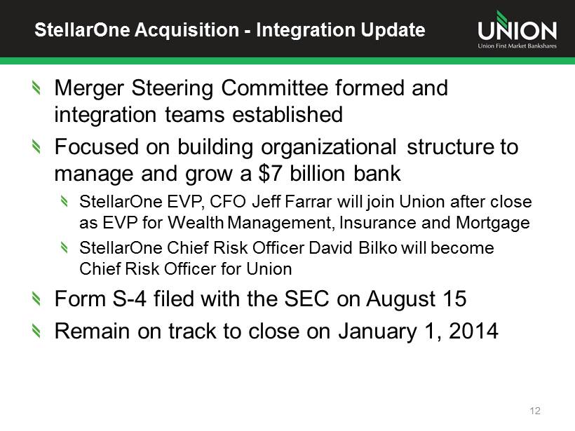 StellarOne Acquisition - Integration Update Merger Steering Committee formed and integration teams established Focused on building organizational structure to manage and grow a $7 billion bank StellarOne EVP, CFO Jeff Farrar will join Union after close as EVP for Wealth Management, Insurance and Mortgage StellarOne Chief Risk Officer David Bilko will become Chief Risk Officer for Union Form S - 4 filed with the SEC on August 15 Remain on track to close on January 1, 2014 12