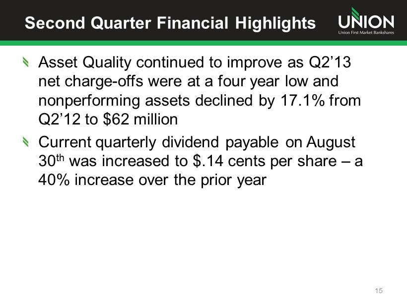 Second Quarter Financial Highlights Operating earnings (1) for Q2’13 were $10.4 million; an increase of 15.6% from Q1’13 and 23.3% from Q2’12 Operating (1) ROA – 1.03% Operating (1) ROE – 9.58% Q2’13 operating (1) earnings per share was $0.42; an increase of 16.7% from Q1’13 and 31.3% from Q2’12 Loans grew by $113 million, or 3.9% from Q2’12 and increased at an annualized growth rate of 3.6% from Q1’13 Deposit balances increased $47 million, or 1.5%, from Q2’12 Net core deposit household accounts grew almost 1,100 in Q2’13 consistent with growth in the prior quarter and the 4.4% annualized growth rate in 2012 14 (1) Excludes after tax acquisition - related expenses of $919,000
