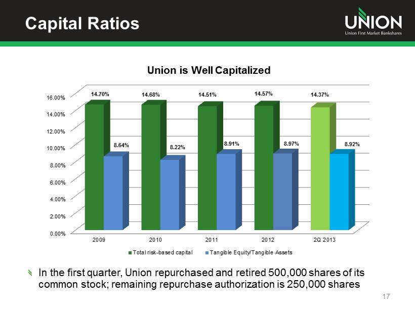 $0 $500,000 $1,000,000 $1,500,000 $2,000,000 $2,500,000 $3,000,000 $3,500,000 $4,000,000 $4,500,000 2009 2010 2011 2012 2Q 2013 $ 2,587 $ 3,837 $ 3,907 $ 4,096 $ 4,057 Balance Sheet Performance 16 Assets ($M) Deposits ($M) Loans ($M) $0 $500,000 $1,000,000 $1,500,000 $2,000,000 $2,500,000 $3,000,000 $3,500,000 2009 2010 2011 2012 2Q 2013 $ 1,874 $ 2,837 $ 2,819 $ 2,967 $ 3,001 $0 $500,000 $1,000,000 $1,500,000 $2,000,000 $2,500,000 $3,000,000 $3,500,000 2009 2010 2011 2012 2Q 2013 $ 1,916 $ 3,070 $ 3,175 $ 3,298 $ 3,266 Nonperforming Assets ($M) $0.0 $10.0 $20.0 $30.0 $40.0 $50.0 $60.0 $70.0 $80.0 $90.0 $100.0 2009 2010 2011 2012 Q2 2013 $22.3 $61.6 $44.8 $26.2 $27.0 $22.5 $36.2 $32.3 $32.8 $35.2 OREO NPLs