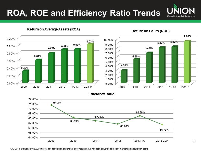 Net Income Trends 18 $0 $5,000 $10,000 $15,000 $20,000 $25,000 $30,000 $35,000 $40,000 2004 2005 2006 2007 2008 2009 2010 2011 2012 2013* $17,925 $24,822 $25,992 $19,756 $14,514 $8,360 $22,922 $30,445 $35,411 $19,365 * 2013 excludes $919,000 in after tax acquisition expenses and reported net income for the first half of 2013 was $18.466 milli on ; prior year periods reflect reported net income