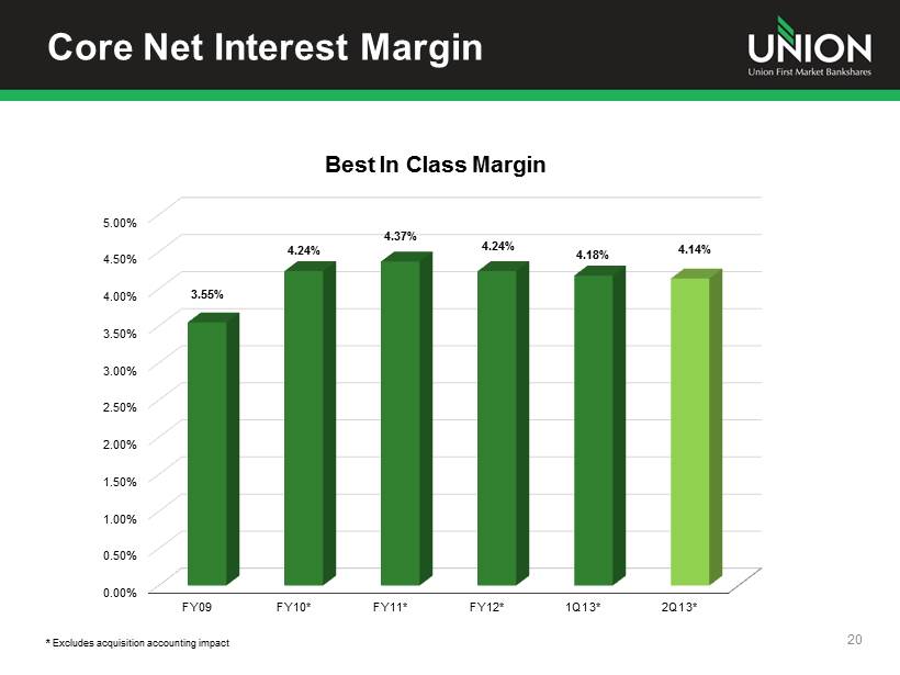 ROA, ROE and Efficiency Ratio Trends 19 0.00% 0.20% 0.40% 0.60% 0.80% 1.00% 1.20% 2009 2010 2011 2012 1Q13 2Q13* 0.32% 0.61% 0.79% 0.89% 0.90% 1.03% Return on Average Assets (ROA) 0.00% 1.00% 2.00% 3.00% 4.00% 5.00% 6.00% 7.00% 8.00% 9.00% 10.00% 2009 2010 2011 2012 1Q13 2Q13* 2.90% 5.50% 6.90% 8.13% 8.32% 9.58% Return on Equity (ROE) 70.81% 68.19% 67.55% 66.86% 68.58% 66.73% 64.00% 65.00% 66.00% 67.00% 68.00% 69.00% 70.00% 71.00% 72.00% 2009 2010 2011 2012 2013 1Q 2013 2Q* Efficiency Ratio * 2Q 2013 excludes $919,000 in after - tax acquisition expenses; prior results have not been adjusted to reflect merger and acquisi tion costs