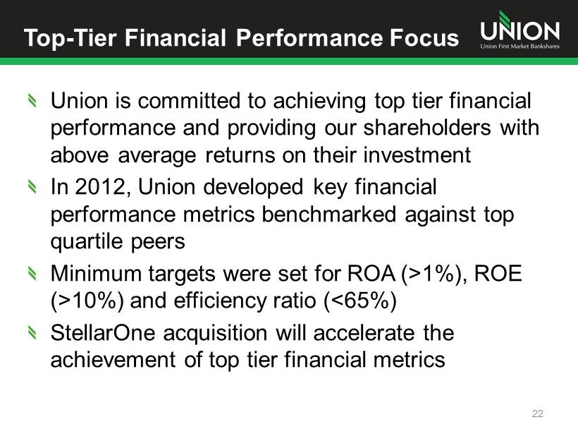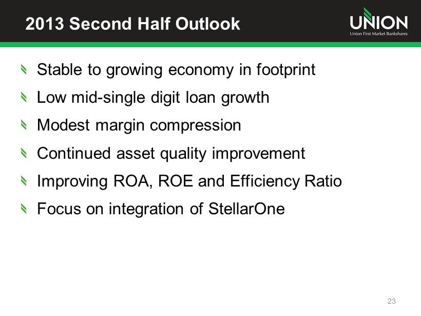 Top - Tier Financial Performance Focus Union is committed to achieving top tier financial performance and providing our shareholders with above average returns on their investment In 2012, Union developed key financial performance metrics benchmarked against top quartile peers Minimum targets were set for ROA (>1%), ROE (>10%) and efficiency ratio (<65%) StellarOne acquisition will accelerate the achievement of top tier financial metrics 22