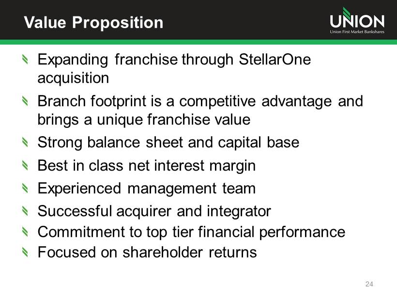 2013 Second Half Outlook Stable to growing economy in footprint Low mid - single digit loan growth Modest margin compression Continued asset quality improvement Improving ROA, ROE and Efficiency Ratio Focus on integration of StellarOne 23