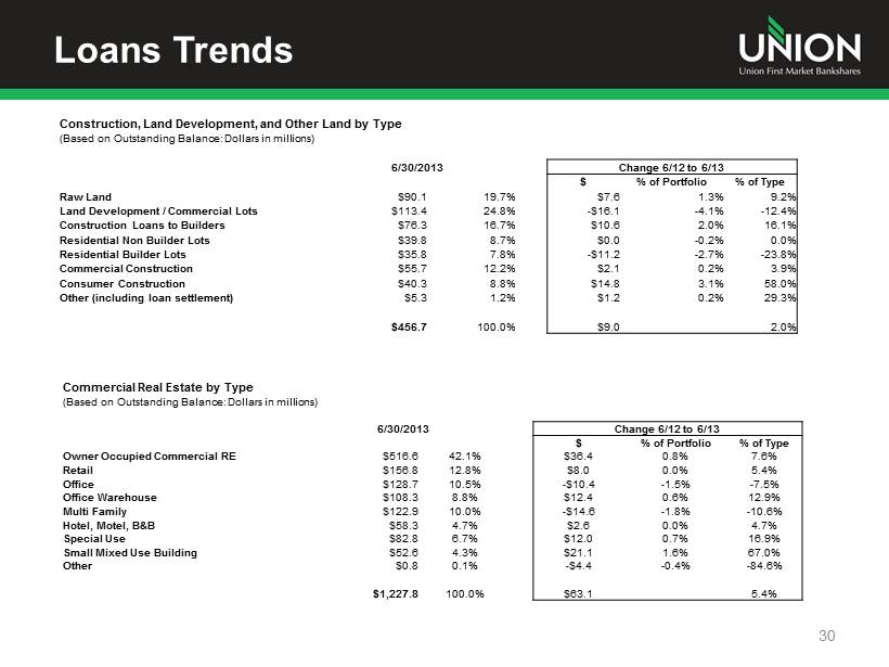 Loan Portfolio 29 Construction, Land Development, and Other Land, 15.2% Commercial Real Estate, 40.9% Residential 1 - 4 Family, 15.9% Equity Lines of Credit , 10.0% Second Mortgages, 1.3% Commercial , 6.1% Personal , 7.9% Credit Cards , 0.7% Other, 2.0% Based on call report filings ($ in millions) 6/30/2013 Change 6/12 to 6/13 $ % $ % of Portfolio % of Type Construction, Land Development, and Other Land $456.7 15.2% $9.0 - 0.3% 2.0% Commercial Real Estate $1,227.8 40.9% $63.1 0.6% 5.4% Residential 1 - 4 Family $478.4 15.9% $19.7 0.1% 4.3% Equity Lines of Credit $298.6 10.0% - $6.0 - 0.6% - 2.0% Second Mortgages $37.9 1.3% - $11.6 - 0.5% - 23.4% Commercial $182.4 6.1% $11.8 0.2% 6.9% Personal $235.8 7.9% $4.5 - 0.2% 1.9% Credit Cards $21.9 0.7% $2.2 0.0% 11.2% Other $61.3 2.0% $20.3 0.6% 49.5% Gross Loans $3,000.8 100.0% $113.0 3.9%