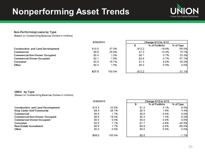 Loans Trends 30 Construction, Land Development, and Other Land by Type (Based on Outstanding Balance: Dollars in millions) 6/30/2013 Change 6/12 to 6/13 $ % of Portfolio % of Type Raw Land $90.1 19.7% $7.6 1.3% 9.2% Land Development / Commercial Lots $113.4 24.8% - $16.1 - 4.1% - 12.4% Construction Loans to Builders $76.3 16.7% $10.6 2.0% 16.1% Residential Non Builder Lots $39.8 8.7% $0.0 - 0.2% 0.0% Residential Builder Lots $35.8 7.8% - $11.2 - 2.7% - 23.8% Commercial Construction $55.7 12.2% $2.1 0.2% 3.9% Consumer Construction $40.3 8.8% $14.8 3.1% 58.0% Other (including loan settlement) $5.3 1.2% $1.2 0.2% 29.3% $456.7 100.0% $9.0 2.0% Commercial Real Estate by Type (Based on Outstanding Balance: Dollars in millions) 6/30/2013 Change 6/12 to 6/13 $ % of Portfolio % of Type Owner Occupied Commercial RE $516.6 42.1% $36.4 0.8% 7.6% Retail $156.8 12.8% $8.0 0.0% 5.4% Office $128.7 10.5% - $10.4 - 1.5% - 7.5% Office Warehouse $108.3 8.8% $12.4 0.6% 12.9% Multi Family $122.9 10.0% - $14.6 - 1.8% - 10.6% Hotel, Motel, B&B $58.3 4.7% $2.6 0.0% 4.7% Special Use $82.8 6.7% $12.0 0.7% 16.9% Small Mixed Use Building $52.6 4.3% $21.1 1.6% 67.0% Other $0.8 0.1% - $4.4 - 0.4% - 84.6% $1,227.8 100.0% $63.1 5.4%