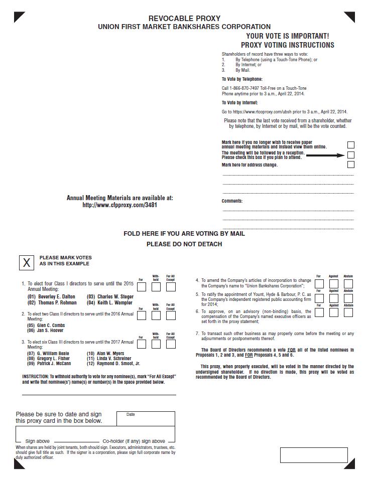 The primary business of the meeting will be: to elect four Class I directors; to elect two Class II directors; to elect six Class III directors; to amend our articles of incorporation to change the company’s name to “Union Bankshares Corporation”; to ratify the appointment of Yount, Hyde & Barbour, P. C. as our independent registered public accounting firm for 2014; and to give advisory (non-binding) approval of the compensation of our named executive officers as disclosed in the proxy statement pursuant to applicable law. We also will report to you about the condition and performance of Union First Market Bankshares Corporation, its subsidiaries, and affiliates. You will have an opportunity to question management or directors about matters that affect the interests of all shareholders. Our independent auditors will also attend the meeting. We hope you will join us at the reception following the meeting.