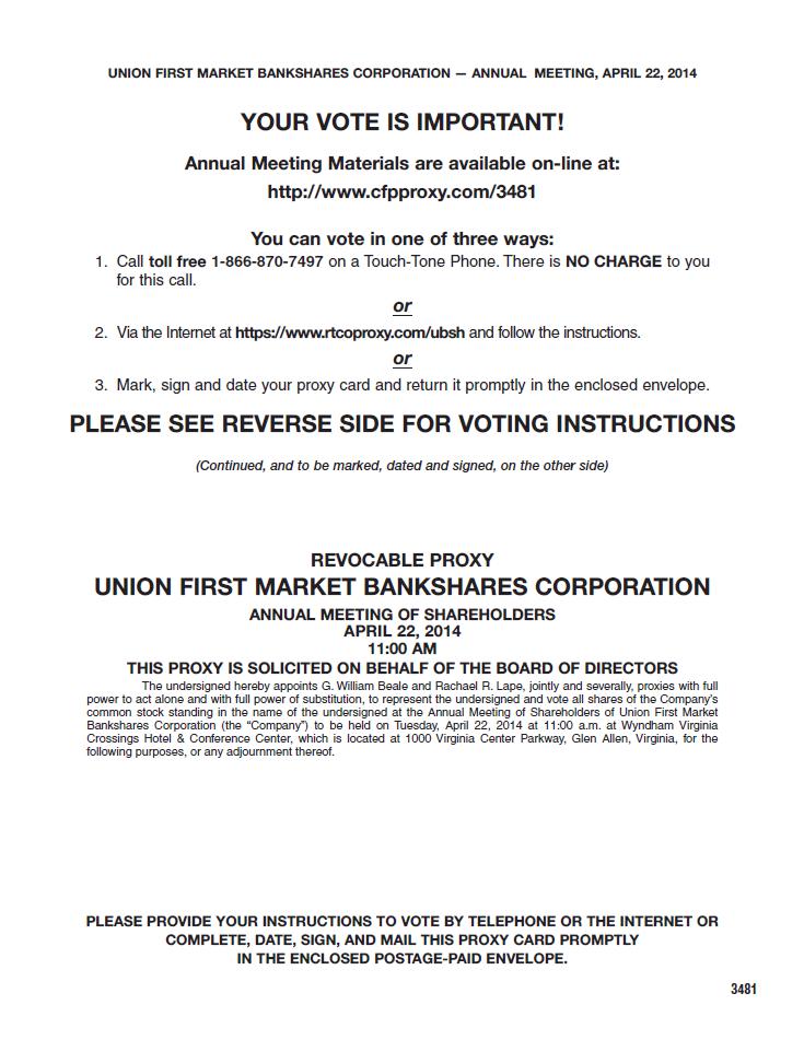 Annual Report on Form 10-K. The Company’s Annual Report on Form 10-K for the year ended December 31, 2013, as filed with the SEC, is being mailed with this proxy statement to those shareholders that receive a copy of the proxy materials in the mail. For those shareholders that received the Notice of Internet Availability of Proxy Materials, this proxy statement and the 2013 Annual Report on Form 10-K are available at: http://www.cfpproxy.com/3481. You may also obtain a copy of the Company’s 2013 Annual Report on Form 10-K (without exhibits), without charge, by sending a written request to: Rachael R. Lape, Corporate Secretary, Union First Market Bankshares Corporation, 1051 E. Cary Street, Suite 1200, Richmond, Virginia 23219. We will provide copies of the exhibits to the 2013 Annual Report on Form 10-K upon payment of a reasonable fee, upon receipt of a request addressed to the Corporate Secretary.