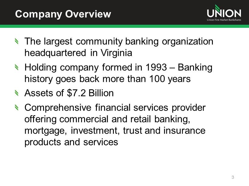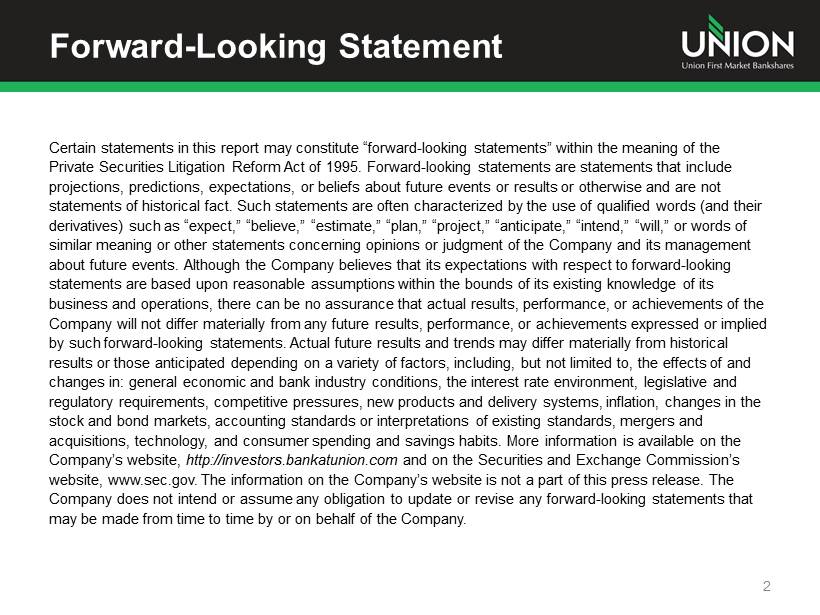 Forward - Looking Statement Certain statements in this report may constitute “forward - looking statements” within the meaning of the Private Securities Litigation Reform Act of 1995. Forward - looking statements are statements that include projections, predictions, expectations, or beliefs about future events or results or otherwise and are not statements of historical fact. Such statements are often characterized by the use of qualified words (and their derivatives) such as “expect,” “believe,” “estimate,” “plan,” “project,” “anticipate,” “intend,” “will,” or words of similar meaning or other statements concerning opinions or judgment of the Company and its management about future events. Although the Company believes that its expectations with respect to forward - looking statements are based upon reasonable assumptions within the bounds of its existing knowledge of its business and operations, there can be no assurance that actual results, performance, or achievements of the Company will not differ materially from any future results, performance, or achievements expressed or implied by such forward - looking statements. Actual future results and trends may differ materially from historical results or those anticipated depending on a variety of factors, including, but not limited to, the effects of and changes in: general economic and bank industry conditions, the interest rate environment, legislative and regulatory requirements, competitive pressures, new products and delivery systems, inflation, changes in the stock and bond markets, accounting standards or interpretations of existing standards, mergers and acquisitions, technology, and consumer spending and savings habits. More information is available on the Company’s website, http://investors.bankatunion.com and on the Securities and Exchange Commission’s website, www.sec.gov. The information on the Company’s website is not a part of this press release. The Company does not intend or assume any obligation to update or revise any forward - looking statements that may be made from time to time by or on behalf of the Company. 2