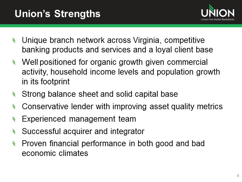 Company Overview The largest community banking organization headquartered in Virginia Holding company formed in 1993 – Banking history goes back more than 100 years Assets of $7.2 Billion Comprehensive financial services provider offering commercial and retail banking, mortgage, investment, trust and insurance products and services 3