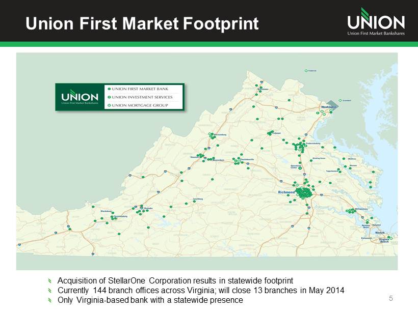 Union’s Strengths Unique branch network across Virginia, competitive banking products and services and a loyal client base Well positioned for organic growth given commercial activity, household income levels and population growth in its footprint Strong balance sheet and solid capital base Conservative lender with improving asset quality metrics Experienced management team Successful acquirer and integrator Proven financial performance in both good and bad economic climates 4