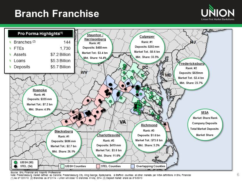 Union First Market Footprint 5 Acquisition of StellarOne Corporation results in statewide footprint Currently 144 branch offices across Virginia; will close 13 branches in May 2014 Only Virginia - based bank with a statewide presence