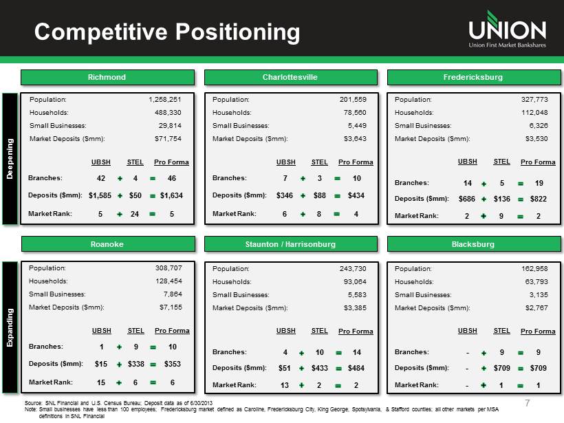 Branch Franchise 6 Source: SNL Financial and MapInfo Professional Note: Fredericksburg market defined as Caroline, Fredericksburg City, King George, Spotsylvania, & Stafford counties; all oth er markets per MSA definitions in SNL Financial (1) As of 12/31/13 (2) Branches as of 2/1/14 - Union will close 13 branches in May 2014 (3) Deposit market share as of 6/30/13 NC DC VA AL CT DE GA IL IN KY MA MD MI MS NJ NY OH RI SC TN WV UBSH Counties STEL Counties Overlapping Counties UBSH (90) STEL (54) Richmond Rank: #5 Deposits: $1.6 bn Market Tot.: $73.6 bn Mkt. Share: 5.3% Blacksburg Rank: #1 Deposits: $696 mm Market Tot.: $2.7 bn Mkt. Share: 26.1% Staunton / Harrisonburg Rank: #2 Deposits: $488 mm Market Tot.: $3.4 bn Mkt. Share: 14.4% Culpeper Rank: #1 Deposits: $202 mm Market Tot.: $0.6 bn Mkt. Share: 33.5% MSA Market Share Rank Company Deposits Total Market Deposits Market Share Roanoke Deposits: $355 mm Market Tot.: $7.2 bn Mkt. Share: 4.9% Rank : #6 Charlottesville Rank: #5 Deposits: $419 mm Market Tot.: $3.6 bn Mkt. Share: 11.6% VA Fredericksburg Rank: #2 Deposits: $820mm Market Tot.: $3.4 bn Mkt. Share: 23.7% Pro Forma Highlights (1) Branches (2) FTEs Assets Loans Deposits 144 1,730 $7.2 Billion $5. 3 Billion $5.7 Billion