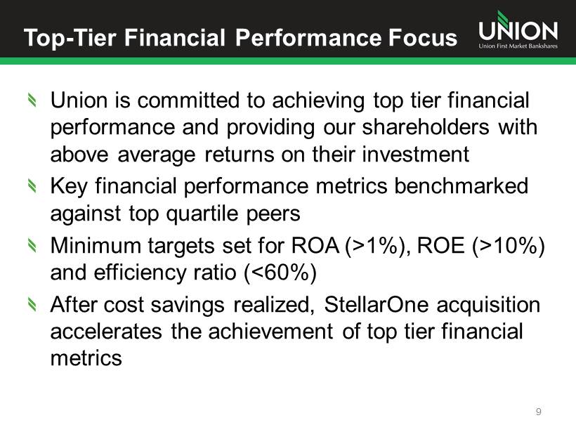 Growing Market Share 8 Virginia Deposit Market Share Source: SNL Financial Deposit data as of 6/30/2013; Pro forma for pending and recently completed transactions Rank Institution (ST) Number of Branches Deposits in Market ($mm) Market Share (%) 1 Wells Fargo & Co. (CA) 295 30,197 18.1 2 Bank of America Corp. (NC) 176 23,291 13.9 3 BB&T Corp. (NC) 366 21,874 13.1 4 SunTrust Banks Inc. (GA) 230 17,233 10.3 5 Capital One Financial Corp. (VA) 86 13,078 7.8 Pro Forma - Union First Market Bkshs Corp. (VA) 145 5,748 3.4 6 United Bankshares Inc. (WV) 68 3,961 2.4 7 Carter Bank & Trust (VA) 88 3,758 2.2 8 Union First Market Bkshs Corp. (VA) 90 3,271 2.0 9 TowneBank (VA) 22 3,251 1.9 10 PNC Financial Services Group (PA) 101 2,899 1.7 11 StellarOne Corp. (VA) 55 2,476 1.5 12 Burke & Herbert Bank & Trust (VA) 25 2,204 1.3 13 Cardinal Financial Corp. (VA) 33 2,198 1.3 14 Citigroup Inc. (NY) 11 1,964 1.2 15 First Citizens BancShares Inc. (NC) 47 1,347 0.8 Totals (1-10) 1,522 122,813 73.5 Totals (1-135) 2,589 167,036 100.0