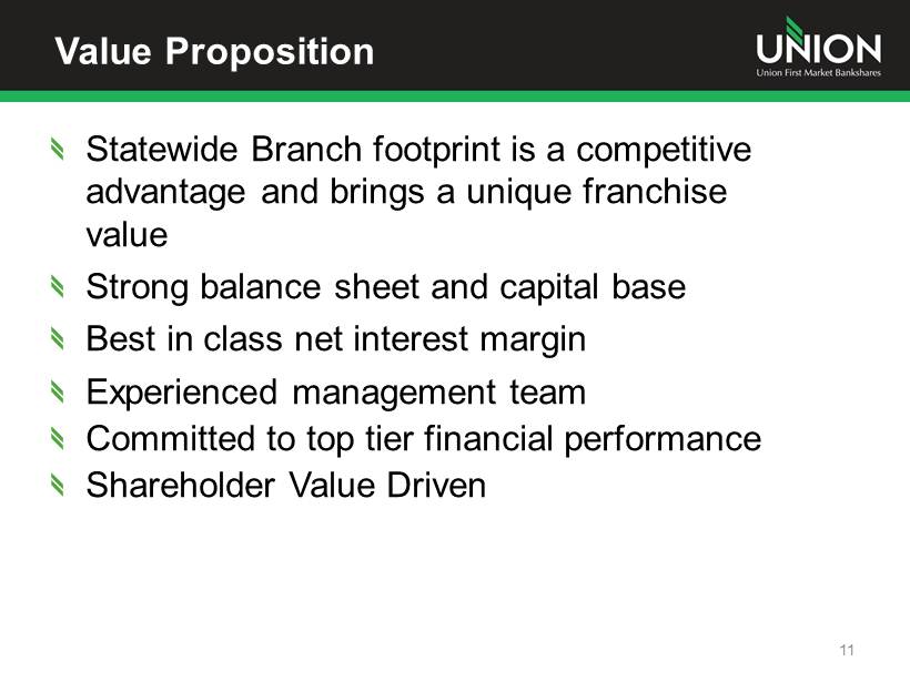 Top - Tier Financial Performance Focus Union is committed to achieving top tier financial performance and providing our shareholders with above average returns on their investment Key financial performance metrics benchmarked against top quartile peers Minimum targets set for ROA (>1%), ROE (>10%) and efficiency ratio (<60%) After cost savings realized, StellarOne acquisition accelerates the achievement of top tier financial metrics 9