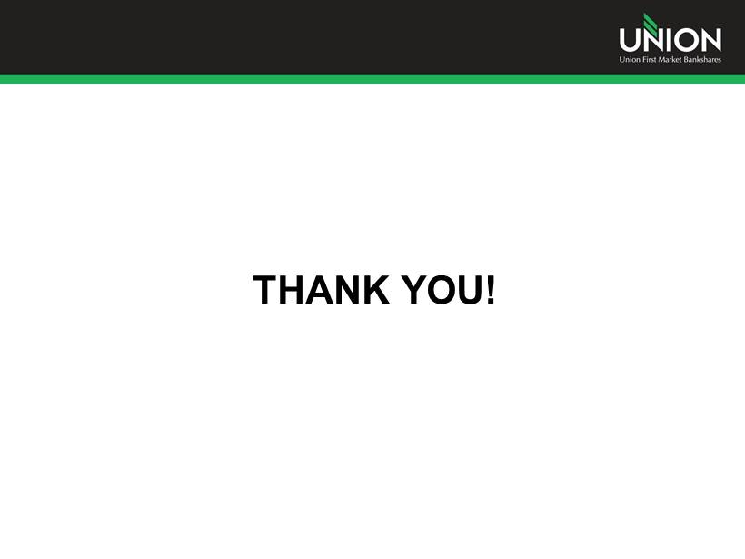 2014 Outlook Focus on integration of StellarOne and achieving cost savings target Stable to growing economy in footprint Mid - single digit loan growth Modest net interest margin compression Continued asset quality improvement Improving ROA, ROE and Efficiency Ratio $65 million in share repurchases authorized through 2015 10