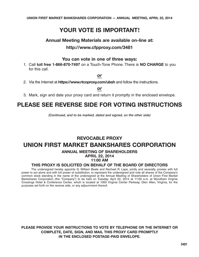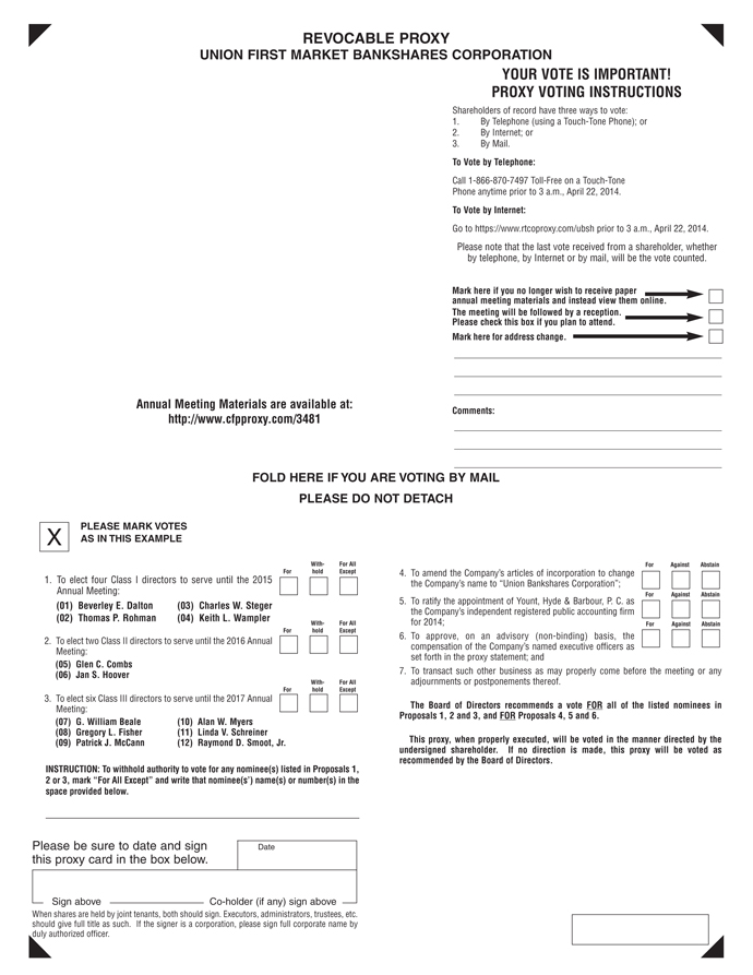 The primary business of the meeting will be: to elect four Class I directors; to elect two Class II directors; to elect six Class III directors; to amend our articles of incorporation to change the company’s name to “Union Bankshares Corporation”; to ratify the appointment of Yount, Hyde & Barbour, P. C. as our independent registered public accounting firm for 2014; and to give advisory (non-binding) approval of the compensation of our named executive officers as disclosed in the proxy statement pursuant to applicable law. We also will report to you about the condition and performance of Union First Market Bankshares Corporation, its subsidiaries, and affiliates. You will have an opportunity to question management or directors about matters that affect the interests of all shareholders. Our independent auditors will also attend the meeting. We hope you will join us at the reception following the meeting.