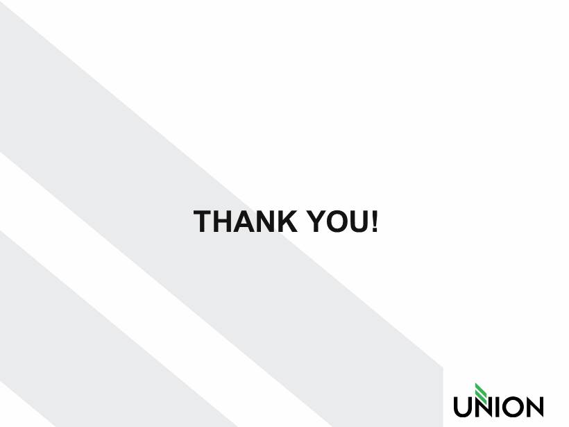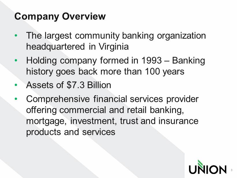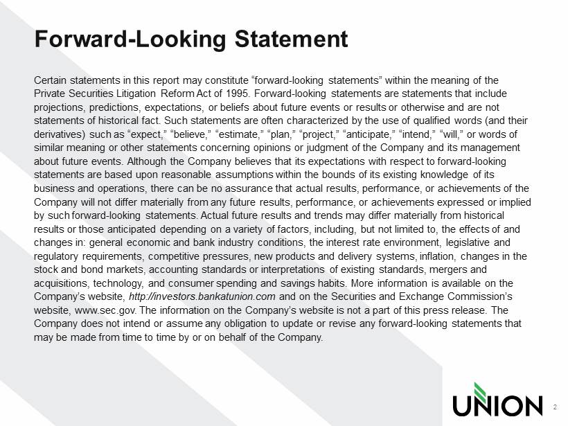 Forward - Looking Statement Certain statements in this report may constitute “forward - looking statements” within the meaning of the Private Securities Litigation Reform Act of 1995. Forward - looking statements are statements that include projections, predictions, expectations, or beliefs about future events or results or otherwise and are not statements of historical fact. Such statements are often characterized by the use of qualified words (and their derivatives) such as “expect,” “believe,” “estimate,” “plan,” “project,” “anticipate,” “intend,” “will,” or words of similar meaning or other statements concerning opinions or judgment of the Company and its management about future events. Although the Company believes that its expectations with respect to forward - looking statements are based upon reasonable assumptions within the bounds of its existing knowledge of its business and operations, there can be no assurance that actual results, performance, or achievements of the Company will not differ materially from any future results, performance, or achievements expressed or implied by such forward - looking statements. Actual future results and trends may differ materially from historical results or those anticipated depending on a variety of factors, including, but not limited to, the effects of and changes in: general economic and bank industry conditions, the interest rate environment, legislative and regulatory requirements, competitive pressures, new products and delivery systems, inflation, changes in the stock and bond markets, accounting standards or interpretations of existing standards, mergers and acquisitions, technology, and consumer spending and savings habits. More information is available on the Company’s website, http://investors.bankatunion.com and on the Securities and Exchange Commission’s website, www.sec.gov. The information on the Company’s website is not a part of this press release. The Company does not intend or assume any obligation to update or revise any forward - looking statements that may be made from time to time by or on behalf of the Company. 2