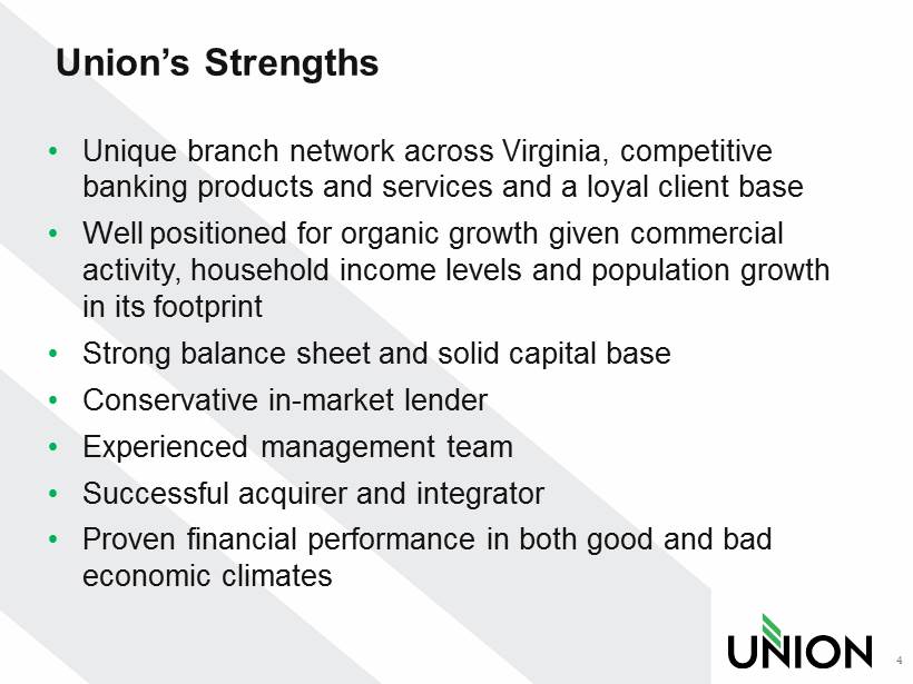 Company Overview • The largest community banking organization headquartered in Virginia • Holding company formed in 1993 – Banking history goes back more than 100 years • Assets of $7.3 Billion • Comprehensive financial services provider offering commercial and retail banking, mortgage, investment, trust and insurance products and services 3