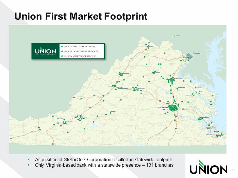 Union’s Strengths • Unique branch network across Virginia, competitive banking products and services and a loyal client base • Well positioned for organic growth given commercial activity, household income levels and population growth in its footprint • Strong balance sheet and solid capital base • Conservative in - market lender • Experienced management team • Successful acquirer and integrator • Proven financial performance in both good and bad economic climates 4