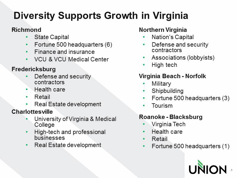 Union First Market Footprint 5 • Acquisition of StellarOne Corporation resulted in statewide footprint • Only Virginia - based bank with a statewide presence – 131 branches