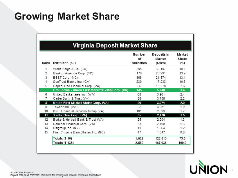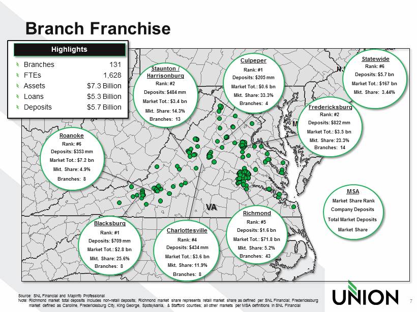 NC DC VA AL CT DE GA IL IN KY MA MD MI MS NJ NY OH RI SC TN WV Branch Franchise 7 Branches FTEs Assets Loans Deposits 131 1,628 $7.3 Billion $5. 3 Billion $5.7 Billion Source: SNL Financial and MapInfo Professional Note: Richmond market total deposits includes non - retail deposits; Richmond market share represents retail market share as defin ed per SNL Financial; Fredericksburg market defined as Caroline, Fredericksburg City, King George, Spotsylvania, & Stafford counties; all other markets per MSA de fin itions in SNL Financial Richmond Rank: #5 Deposits: $1.6 bn Market Tot.: $71.8 bn Mkt. Share: 5.2% Blacksburg Rank: #1 Deposits: $709 mm Market Tot.: $2.8 bn Mkt. Share: 25.6% Staunton / Harrisonburg Rank: #2 Deposits: $484 mm Market Tot.: $3.4 bn Mkt. Share: 14.3% Culpeper Rank: #1 Deposits: $205 mm Market Tot.: $0.6 bn Mkt. Share: 33.3% MSA Market Share Rank Company Deposits Total Market Deposits Market Share Roanoke Deposits: $353 mm Market Tot.: $7.2 bn Mkt. Share: 4.9% Rank : #6 Charlottesville Rank: #4 Deposits: $434 mm Market Tot.: $3.6 bn Mkt. Share: 11.9% VA Fredericksburg Rank: #2 Deposits: $822 mm Market Tot.: $3.5 bn Mkt. Share: 23.3% Branches: 8 Branches: 13 Branches: 4 Branches: 14 Branches: 43 Branches: 8 Branches: 8 Statewide Rank: #6 Deposits: $5.7 bn Market Tot.: $167 bn Mkt. Share: 3.44% Highlights