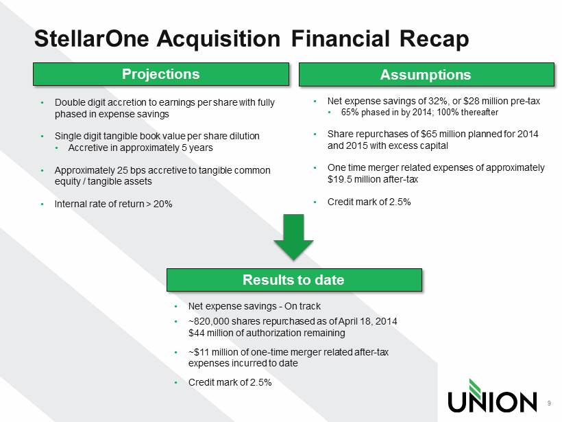 Growing Market Share 8 Virginia Deposit Market Share Source: SNL Financial Deposit data as of 6/30/2013; Pro forma for pending and recently completed transactions Rank Institution (ST) Number of Branches Deposits in Market ($mm) Market Share (%) 1 Wells Fargo & Co. (CA) 295 30,197 18.1 2 Bank of America Corp. (NC) 176 23,291 13.9 3 BB&T Corp. (NC) 366 21,874 13.1 4 SunTrust Banks Inc. (GA) 230 17,233 10.3 5 Capital One Financial Corp. (VA) 86 13,078 7.8 Pro Forma - Union First Market Bkshs Corp. (VA) 145 5,748 3.4 6 United Bankshares Inc. (WV) 68 3,961 2.4 7 Carter Bank & Trust (VA) 88 3,758 2.2 8 Union First Market Bkshs Corp. (VA) 90 3,271 2.0 9 TowneBank (VA) 22 3,251 1.9 10 PNC Financial Services Group (PA) 101 2,899 1.7 11 StellarOne Corp. (VA) 55 2,476 1.5 12 Burke & Herbert Bank & Trust (VA) 25 2,204 1.3 13 Cardinal Financial Corp. (VA) 33 2,198 1.3 14 Citigroup Inc. (NY) 11 1,964 1.2 15 First Citizens BancShares Inc. (NC) 47 1,347 0.8 Totals (1-10) 1,522 122,813 73.5 Totals (1-135) 2,589 167,036 100.0