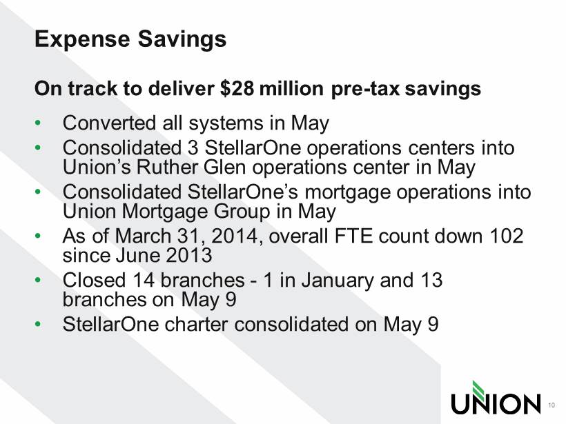 StellarOne Acquisition Financial Recap 9 Projections Assumptions • Net expense savings of 32%, or $28 million pre - tax • 65% phased in by 2014; 100% thereafter • Share repurchases of $65 million planned for 2014 and 2015 with excess capital • One time merger related expenses of approximately $19.5 million after - tax • Credit mark of 2.5% • Double digit accretion to earnings per share with fully phased in expense savings • Single digit tangible book value per share dilution • Accretive in approximately 5 years • Approximately 25 bps accretive to tangible common equity / tangible assets • Internal rate of return > 20% Results to date • Net expense savings - On track • ~820 ,000 shares repurchased as of April 18, 2014 $44 million of authorization remaining • ~$11 million of one - time merger related after - tax expenses incurred to date • Credit mark of 2.5%