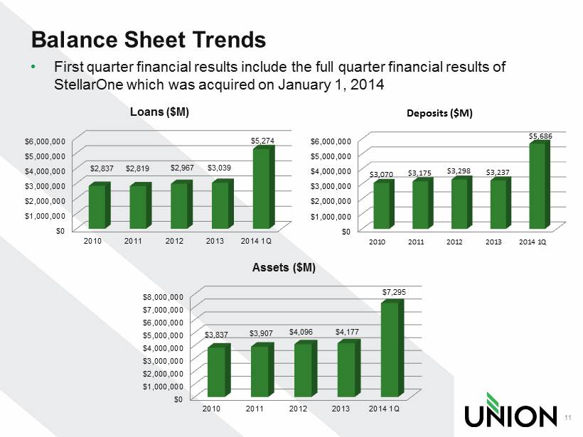 Expense Savings On track to deliver $28 million pre - tax savings • Converted all systems in May • Consolidated 3 StellarOne operations centers into Union’s Ruther Glen operations center in May • Consolidated StellarOne’s mortgage operations into Union Mortgage Group in May • As of March 31, 2014, overall FTE count down 102 since June 2013 • Closed 14 branches - 1 in January and 13 branches on May 9 • StellarOne charter consolidated on May 9 10