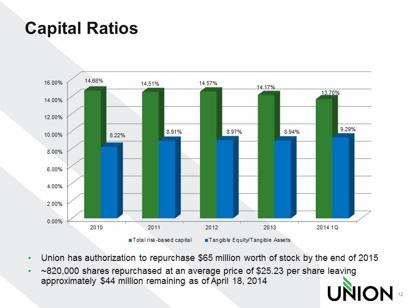 Balance Sheet Trends 11 $0 $1,000,000 $2,000,000 $3,000,000 $4,000,000 $5,000,000 $6,000,000 2010 2011 2012 2013 2014 1Q $ 2,837 $ 2,819 $ 2,967 $ 3,039 $ 5,274 Loans ($M) $0 $1,000,000 $2,000,000 $3,000,000 $4,000,000 $5,000,000 $6,000,000 2010 2011 2012 2013 2014 1Q $ 3,070 $ 3,175 $ 3,298 $ 3,237 $ 5,686 Deposits ($M) $0 $1,000,000 $2,000,000 $3,000,000 $4,000,000 $5,000,000 $6,000,000 $7,000,000 $8,000,000 2010 2011 2012 2013 2014 1Q $3,837 $3,907 $4,096 $4,177 $7,295 Assets ($M) • First quarter financial results include the full quarter financial results of StellarOne which was acquired on January 1, 2014
