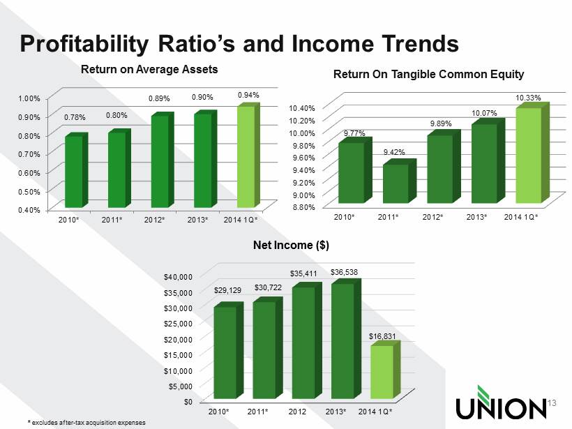 Capital Ratios 12 • Union has authorization to repurchase $65 million worth of stock by the end of 2015 • ~820,000 shares repurchased at an average price of $25.23 per share leaving approximately $44 million remaining as of April 18, 2014 0.00% 2.00% 4.00% 6.00% 8.00% 10.00% 12.00% 14.00% 16.00% 2010 2011 2012 2013 2014 1Q 14.68% 14.51% 14.57% 14.17% 13.70% 8.22% 8.91% 8.97% 8.94% 9.29% Total risk-based capital Tangible Equity/Tangible Assets