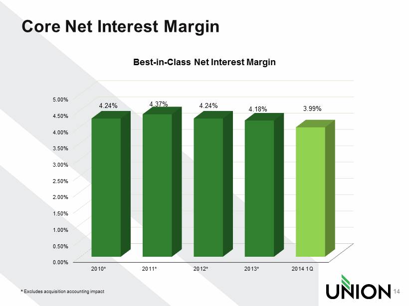 Profitability Ratio’s and Income Trends 13 * excludes after - tax acquisition expenses 0.40% 0.50% 0.60% 0.70% 0.80% 0.90% 1.00% 2010* 2011* 2012* 2013* 2014 1Q* 0.78% 0.80% 0.89% 0.90% 0.94% Return on Average Assets 8.80% 9.00% 9.20% 9.40% 9.60% 9.80% 10.00% 10.20% 10.40% 2010* 2011* 2012* 2013* 2014 1Q* 9.77% 9.42% 9.89% 10.07% 10.33% Return On Tangible Common Equity $0 $5,000 $10,000 $15,000 $20,000 $25,000 $30,000 $35,000 $40,000 2010* 2011* 2012 2013* 2014 1Q* $29,129 $ 30,722 $35,411 $36,538 $16,831 Net Income ($)