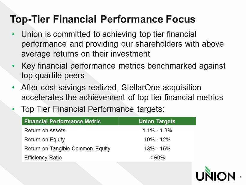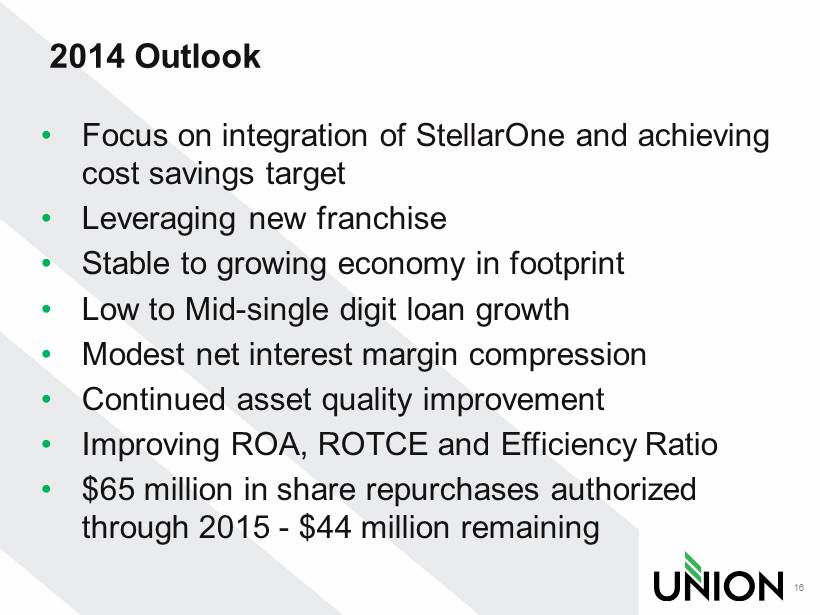 Top - Tier Financial Performance Focus • Union is committed to achieving top tier financial performance and providing our shareholders with above average returns on their investment • Key financial performance metrics benchmarked against top quartile peers • After cost savings realized, StellarOne acquisition accelerates the achievement of top tier financial metrics • Top Tier Financial Performance targets: 15 Financial Performance Metric Union Targets Return on Assets 1.1% - 1.3% Return on Equity 10% - 12% Return on Tangible Common Equity 13% - 15% Efficiency Ratio < 60%