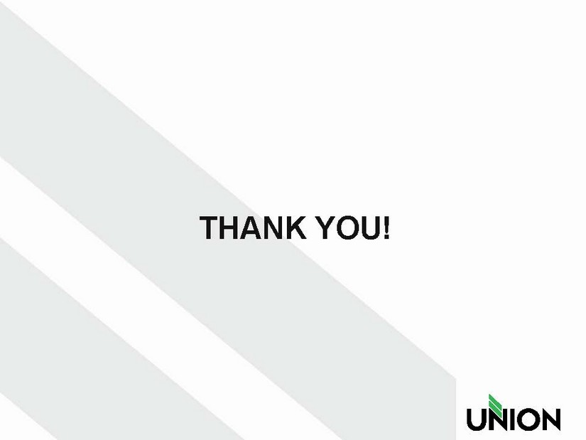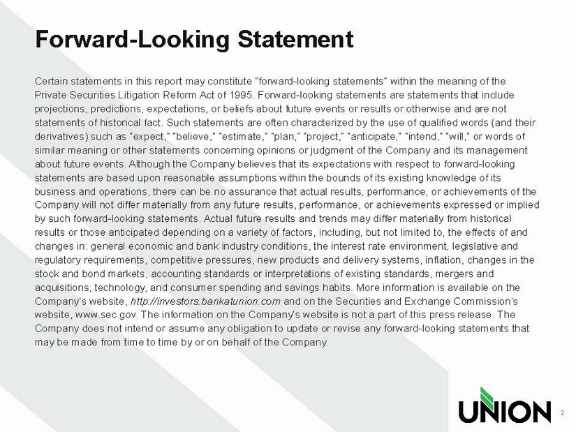 Forward - Looking Statement Certain statements in this report may constitute “forward - looking statements” within the meaning of the Private Securities Litigation Reform Act of 1995. Forward - looking statements are statements that include projections, predictions, expectations, or beliefs about future events or results or otherwise and are not statements of historical fact. Such statements are often characterized by the use of qualified words (and their derivatives) such as “expect,” “believe,” “estimate,” “plan,” “project,” “anticipate,” “intend,” “will,” or words of similar meaning or other statements concerning opinions or judgment of the Company and its management about future events. Although the Company believes that its expectations with respect to forward - looking statements are based upon reasonable assumptions within the bounds of its existing knowledge of its business and operations, there can be no assurance that actual results, performance, or achievements of the Company will not differ materially from any future results, performance, or achievements expressed or implied by such forward - looking statements. Actual future results and trends may differ materially from historical results or those anticipated depending on a variety of factors, including, but not limited to, the effects of and changes in: general economic and bank industry conditions, the interest rate environment, legislative and regulatory requirements, competitive pressures, new products and delivery systems, inflation, changes in the stock and bond markets, accounting standards or interpretations of existing standards, mergers and acquisitions, technology, and consumer spending and savings habits. More information is available on the Company’s website, http://investors.bankatunion.com and on the Securities and Exchange Commission’s website, www.sec.gov. The information on the Company’s website is not a part of this press release. The Company does not intend or assume any obligation to update or revise any forward - looking statements that may be made from time to time by or on behalf of the Company. 2