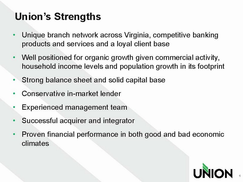 Company Overview • The largest community banking organization headquartered in Virginia • Holding company formed in 1993 – Banking history goes back more than 100 years • Assets of $7.4 Billion • Comprehensive financial services provider offering commercial and retail banking, mortgage, investment, trust and insurance products and services 3
