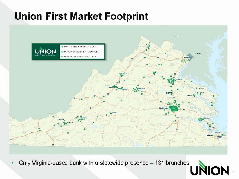 Union’s Strengths • Unique branch network across Virginia, competitive banking products and services and a loyal client base • Well positioned for organic growth given commercial activity, household income levels and population growth in its footprint • Strong balance sheet and solid capital base • Conservative in - market lender • Experienced management team • Successful acquirer and integrator • Proven financial performance in both good and bad economic climates 4