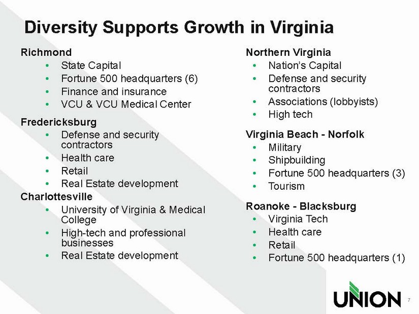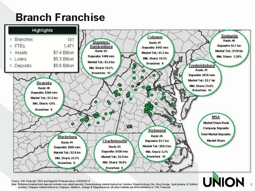 Union First Market Footprint 5 • Only Virginia - based bank with a statewide presence – 131 branches