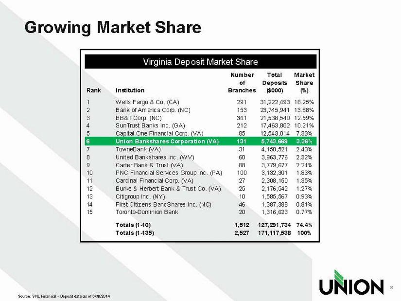 NC DC VA AL CT DE GA IL IN KY MA MD MI MS NJ NY OH RI SC TN WV Branch Franchise 6 Branches FTEs Assets Loans Deposits 131 1,471 $7.4 Billion $5 .3 Billion $5.6 Billion Source: SNL Financial, FDIC and MapInfo Professional as of 6/30/2014 Note: Richmond market total deposits includes non - retail deposits; Fredericksburg market defined as Caroline, Fredericksburg Cit y, King George, Spotsylvania, & Stafford counties; Culpeper market defined as Culpeper, Madison, Orange & Rappahannock; all other markets per MSA definitions in SNL F ina ncial Richmond Rank: #5 Deposits: $1.7 bn Market Tot.: $68.3 bn Mkt. Share: 5.2% Blacksburg Rank: #1 Deposits: $685 mm Market Tot.: $2.9 bn Mkt. Share: 23.1% Staunton / Harrisonburg Rank: #2 Deposits: $480 mm Market Tot.: $3.4 bn Mkt. Share: 14.2% Culpeper Rank: #1 Deposits: $443 mm Market Tot.: $ 1 .3 bn Mkt. Share: 34.3% MSA Market Share Rank Company Deposits Total Market Deposits Market Share Roanoke Deposits: $360 mm Market Tot.: $7.3 bn Mkt. Share: 4.9% Rank : #6 Charlottesville Rank: #4 Deposits: $430 mm Market Tot.: $3.9 bn Mkt. Share: 10.8% VA Fredericksburg Rank: #1 Deposits: $876 mm Market Tot.: $3.7 bn Mkt. Share: 23.6% Branches: 8 Branches: 13 Branches: 8 Branches: 14 Branches: 43 Branches: 8 Branches: 8 Statewide Rank: #6 Deposits: $5.7 bn Market Tot.: $170 bn Mkt. Share: 3.38% Highlights