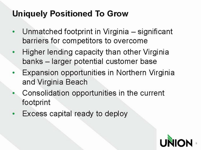 Growing Market Share 8 Source: SNL Financial - Deposit data as of 6/30/2014 Rank Institution Number of Branches Total Deposits ($000) Market Share (%) 1 Wells Fargo & Co. (CA) 291 31,222,493 18.25% 2 Bank of America Corp. (NC) 153 23,745,941 13.88% 3 BB&T Corp. (NC) 361 21,538,540 12.59% 4 SunTrust Banks Inc. (GA) 212 17,463,802 10.21% 5 Capital One Financial Corp. (VA) 85 12,543,014 7.33% 6 Union Bankshares Corporation (VA) 131 5,743,669 3.36% 7 TowneBank (VA) 31 4,158,521 2.43% 8 United Bankshares Inc. (WV) 60 3,963,776 2.32% 9 Carter Bank & Trust (VA) 88 3,779,677 2.21% 10 PNC Financial Services Group Inc. (PA) 100 3,132,301 1.83% 11 Cardinal Financial Corp. (VA) 27 2,308,150 1.35% 12 Burke & Herbert Bank & Trust Co. (VA) 25 2,176,542 1.27% 13 Citigroup Inc. (NY) 10 1,585,567 0.93% 14 First Citizens BancShares Inc. (NC) 46 1,387,388 0.81% 15 Toronto-Dominion Bank 20 1,316,623 0.77% Totals (1-10) 1,512 127,291,734 74.4% Totals (1-135) 2,527 171,117,538 100% Virginia Deposit Market Share